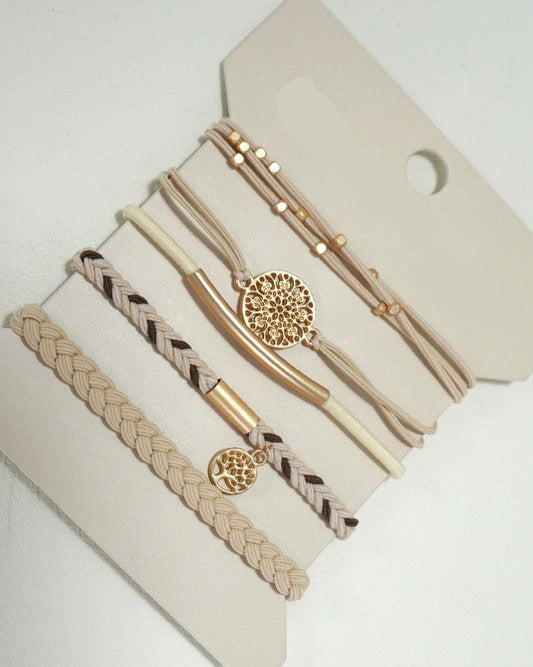 Elegant on your wrist, resilient for your hair! These bracelets offer dual-purpose versatility, functioning as both a stylish wrist accessory and a reliable hair tie." Boho Duo Hair Tie Bracelets, a perfect blend of fashion and function. Designed to be worn both on your wrist and in your hair, these bracelets combine bohemian charm with practical utility. Made from high-quality, stretchable material, they are gentle on your hair while adding a touch of boho elegance to any outfit. Whether you're securing your locks or accessorizing your look, these duo bracelets are your go-to for effortless style and comfort.