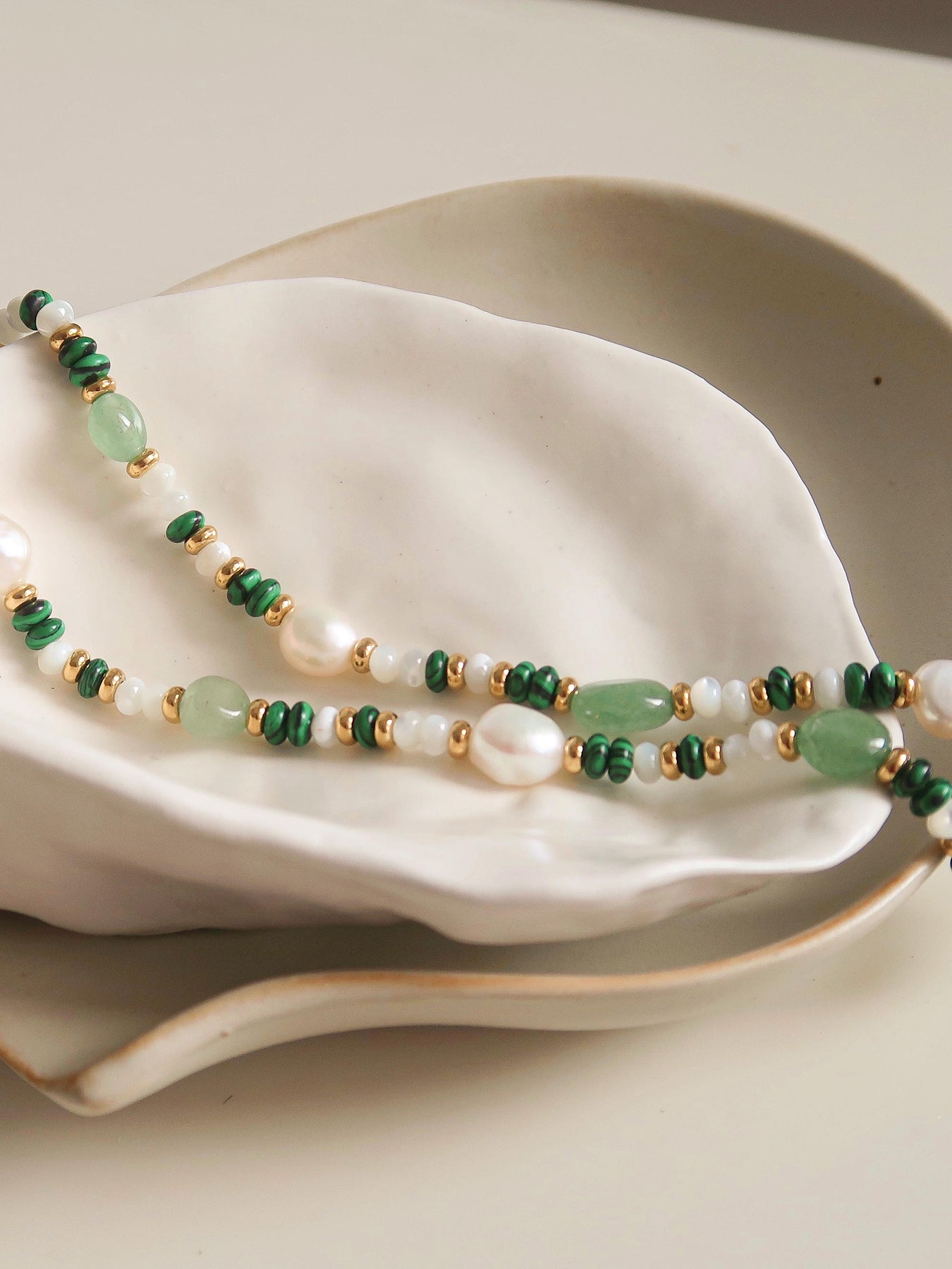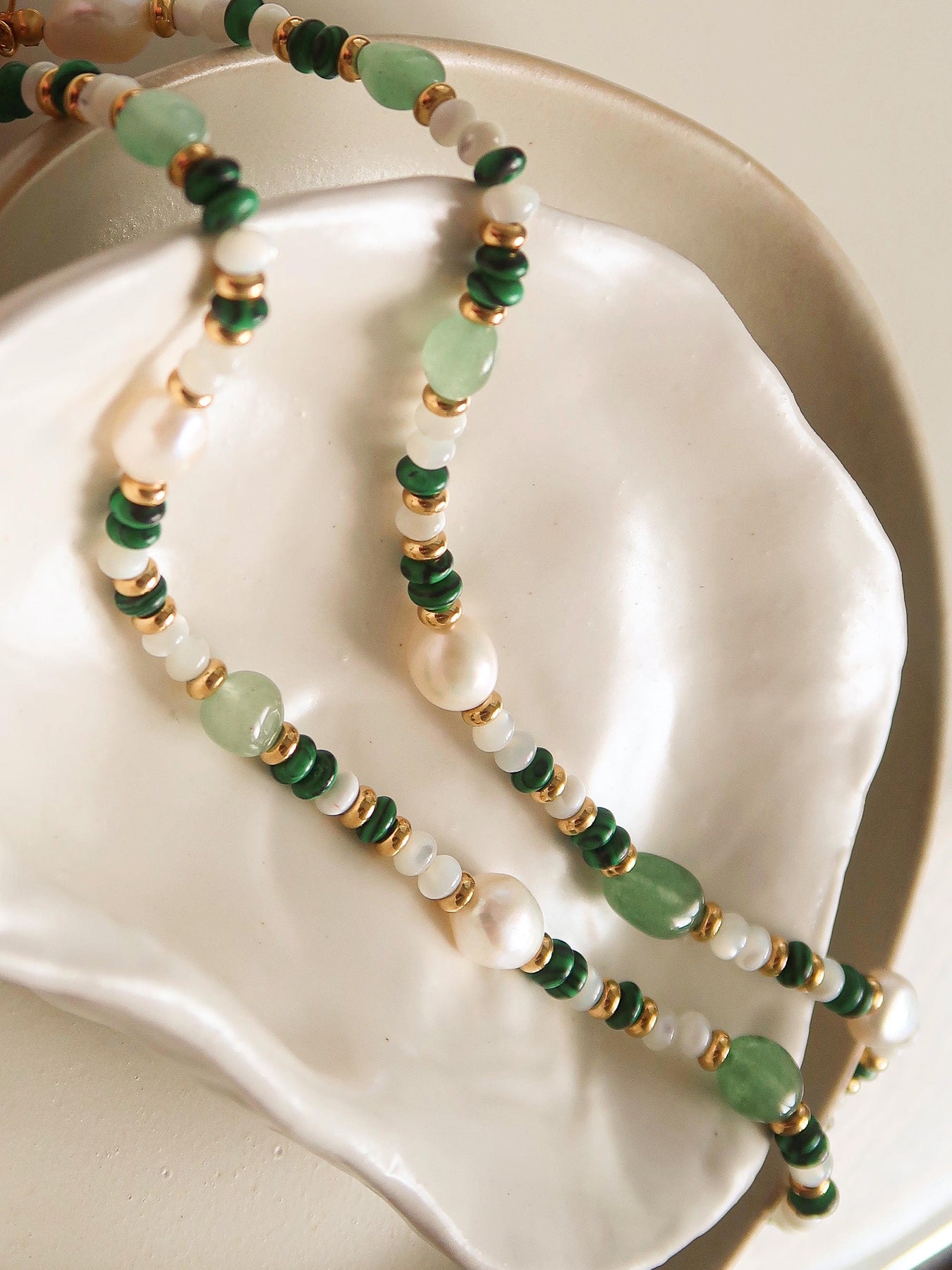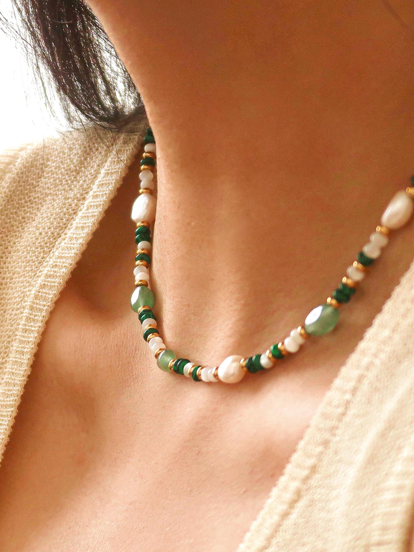Stolen Glances Necklace Elevate your everyday style with this captivating handmade necklace, where natural green stone meets carefully selected beads in a harmonious design. Each piece is thoughtfully crafted to catch the light and draw admiring looks your way. The rich, earthy tones of genuine green stone paired with complementary beads create a versatile accessory that transitions seamlessly from casual to sophisticated occasions. Perfect for those who appreciate artisanal jewelry with character and authenticity. A timeless addition to any collection that speaks to your refined taste.