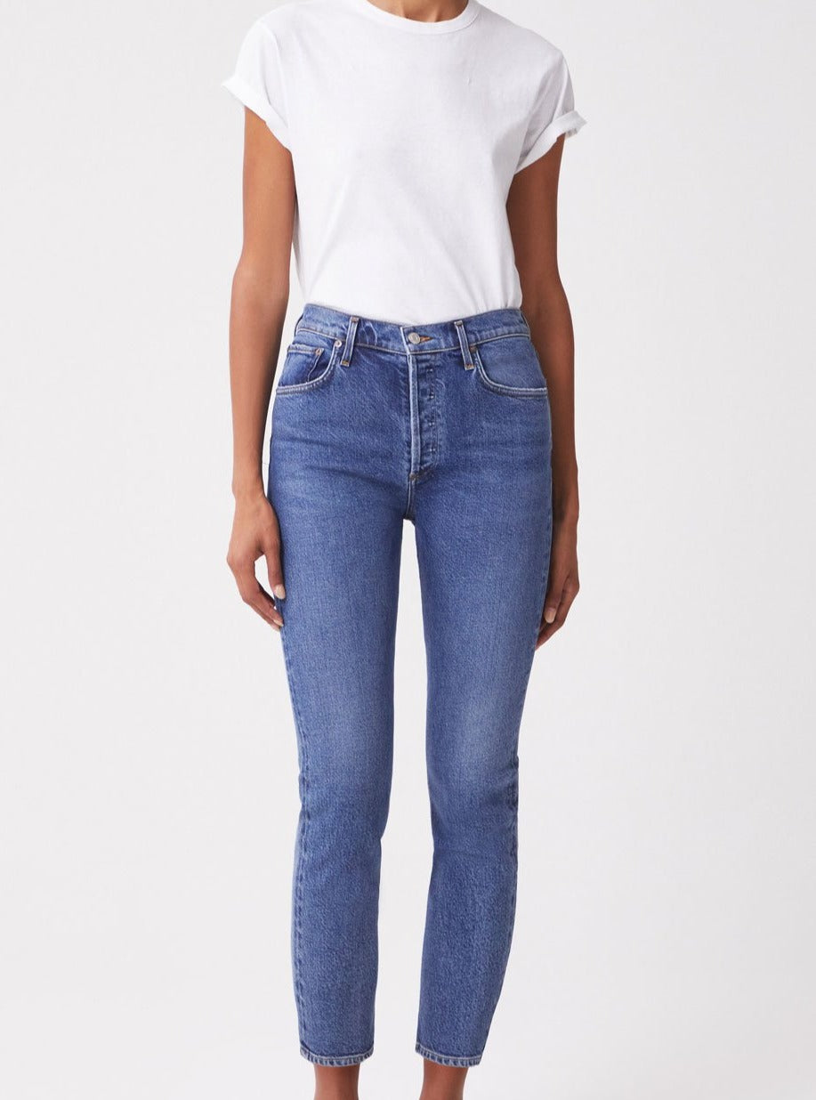 AGOLDE's signature straight leg. With a better-than-vintage aesthetic, the Riley is an iconic brand favorite. The flattering high-rise and straight leg hold close to the body for a universally loved look. A cropped inseam makes these easy to style with anything from sandals to a heeled boot.