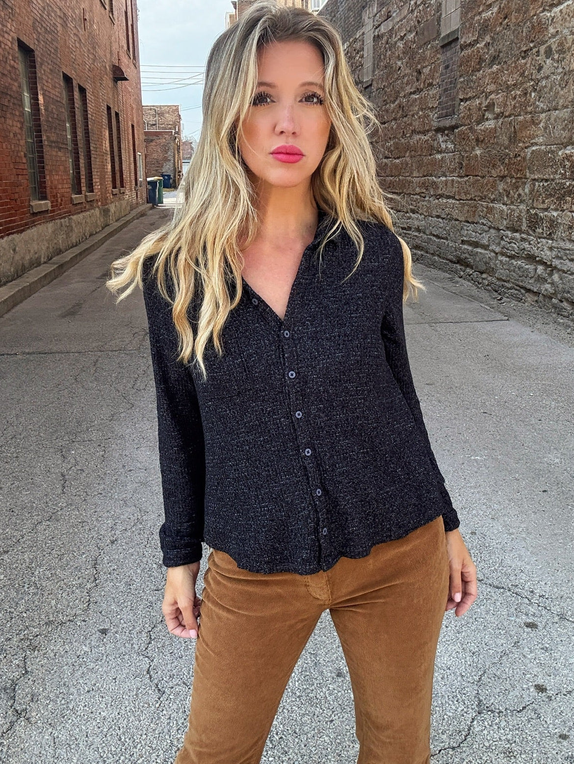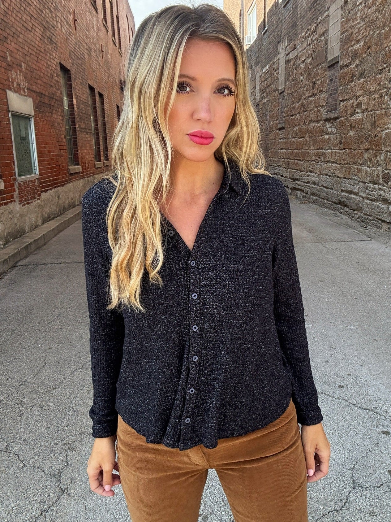Experience cozy elegance with the Hello Nite Harper Top, crafted from a lush waffle knit that feels soft against your skin. This shirt combines breathable comfort with stylish texture, making it perfect for layering or wearing on its own. Elevate your everyday wardrobe with a piece that offers both warmth and effortless charm.