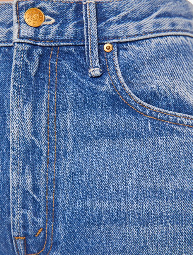 Wide leg jeans from SNACKS!, a collection of unconstrained silhouettes leaning into exaggerated shapes and extreme proportions. Experimental and non-era specific. For everyone, or not. Designed to sit on the hips with a slouchy fit, these super high-waisted jeans have a loose wide leg with a curved outer seam and a long 33.5-inch inseam with a clean hem. Made from a rigid recycled cotton blend, Rolling In The Dough is a mid-blue with a pretzel-detailed button and candy-inspired interior rivets. Would you like a treat?