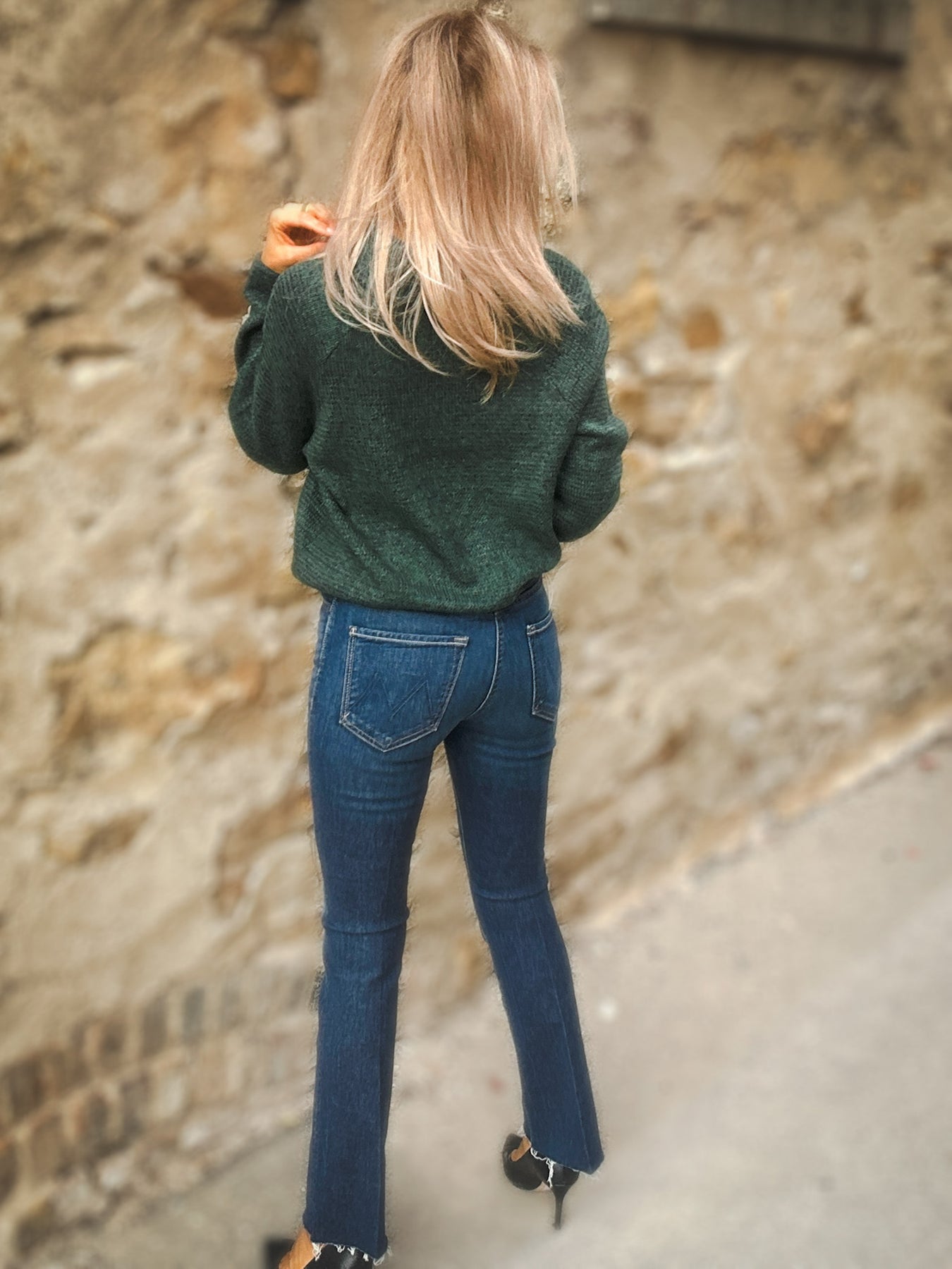 It's your call. This high-rise flare has a 28.25-inch inseam and a frayed hem. Made from stretch denim Kicks And Riffs is a dark blue wash with super-subtle whiskering and fading.
