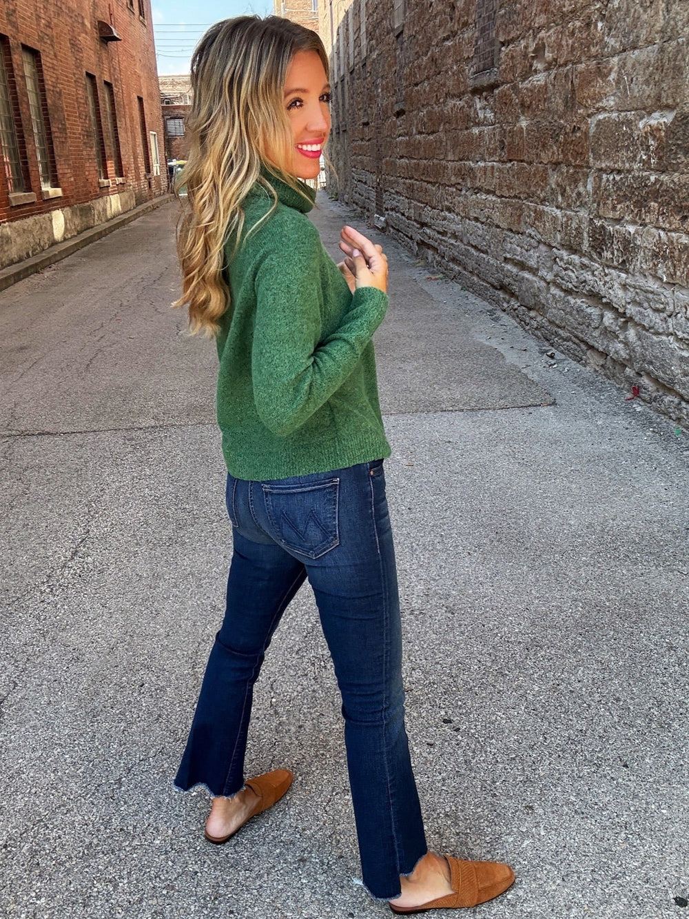 Up to no good. This iconic high-waisted bootcut has a zip fly, ankle-length inseam and a frayed step-hem. Made from a blend of recycled stretch denim, Troublemaker is a mid-blue with whiskering and fading at the knees.
