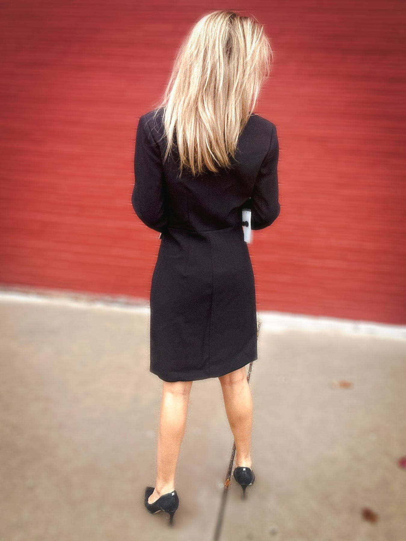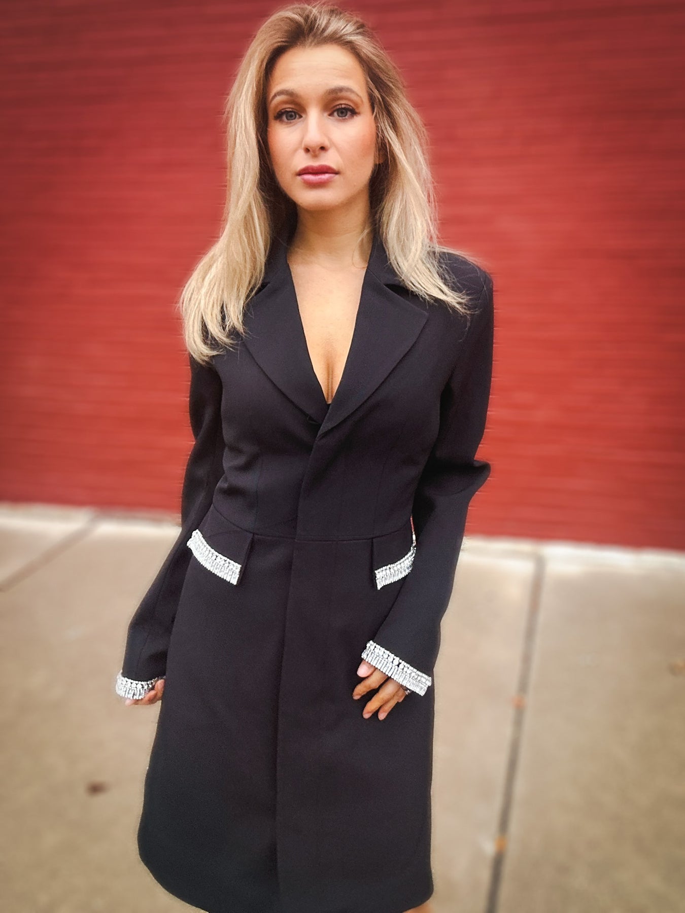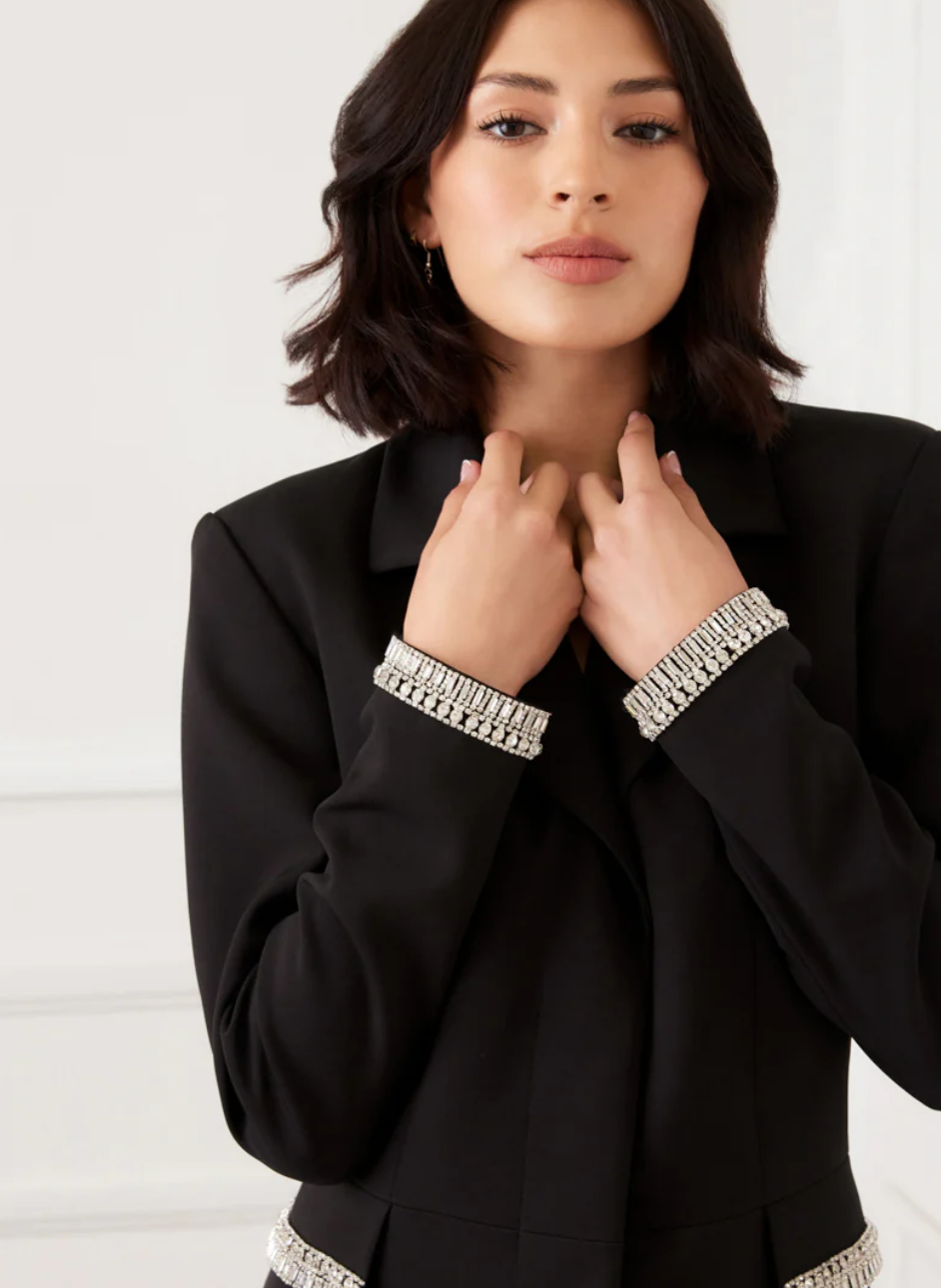 Sophisticated and sleek, this blazer dress is crafted in a crepe woven fabric and is fully lined for a smooth, comfortable finish. Designed with a sharp notched collar and elegant long, set-in sleeves, it delivers a refined, tailored silhouette. The look stays clean with an inner hidden closure, while two front flap pockets are accented with embellished gems, echoed at the cuffs for a touch of statement sparkle. Falling gracefully to the knee length, this piece blends timeless tailoring with modern evening glamour.