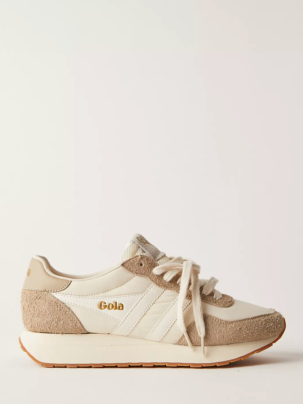 Arizona in off white with bone is an effortlessly chic and versatile women’s sneaker from Gola Classics. This women's jogger inspired sneaker combines a mix of vintage effect nylon with suede panelling and features an oversized sole. A super comfy in-sock has been incorporated for enhanced comfort meaning these beauties look great and feel great on. Arizona pairs perfectly with a smart casual look.