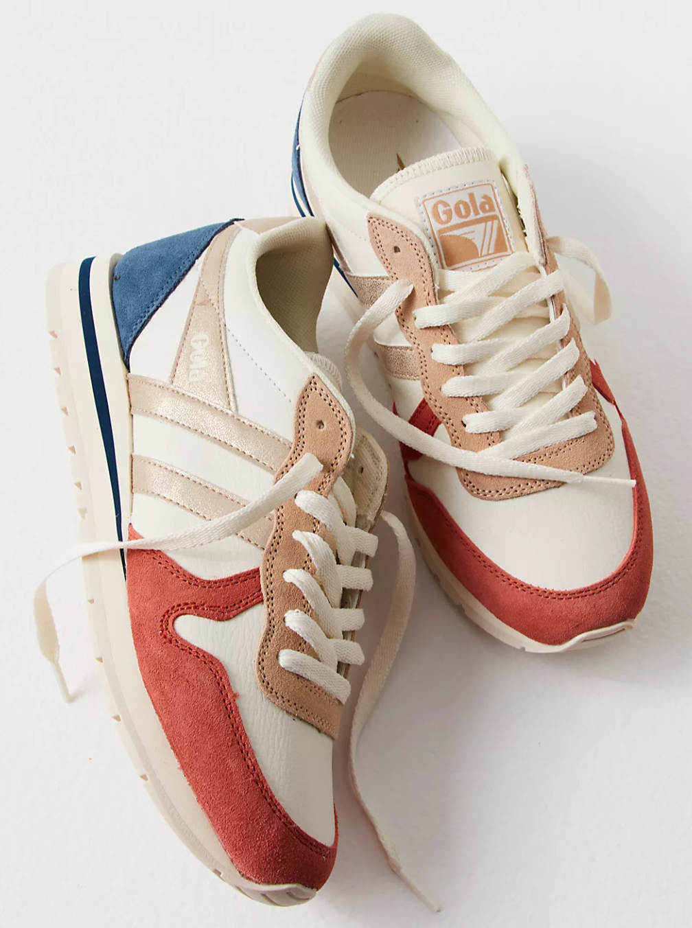 Daytona is Gola’s ‘90s retro jogger, re-imagined with an oversized EVA midsole that gives a nod to its running heritage. Combining a feminine colour palette of orange spice, gold and ink gracing an off white upper, Daytona Quadrant for women ticks all the season’s sneaker boxes.