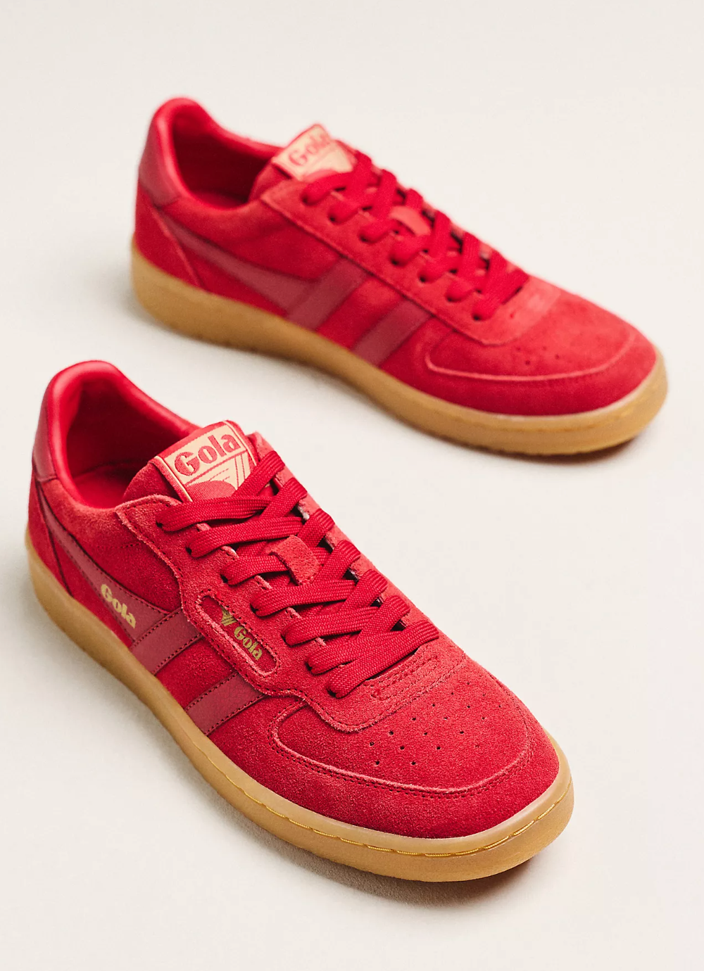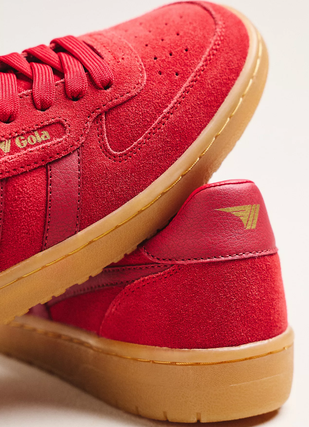 This full suede, self-colour edit of the top selling Gola style Hawk gives a lust-worthy season colour pop to any sneaker collection. Hawk Suede ‘86 for women incorporates layered panels on a classic court-sport inspired upper, to give an effortless contemporary look. Featured here in red tones that are season relevant and are perfectly co-ordinated with a full gum outsole for a go-to old school vibe. Wear with loose fit denim or wide leg trousers for a relaxed look.