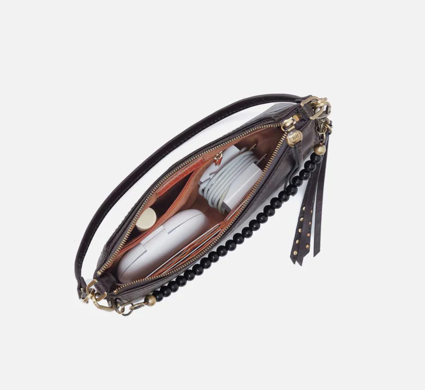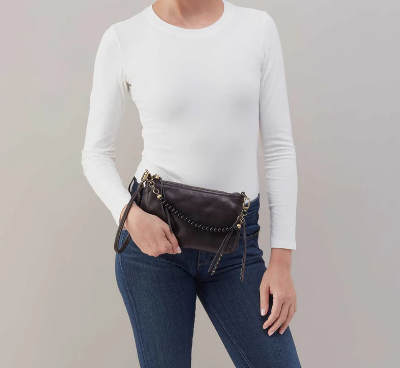 A convertible HOBO style that can be worn three ways: crossbody, baguette bag and wristlet.