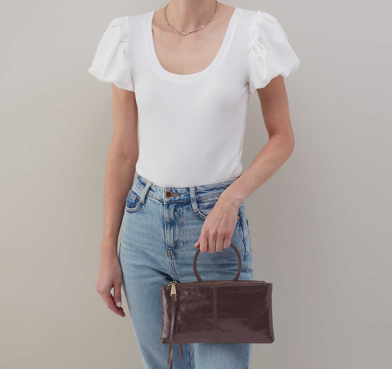 Inspired by their best-selling Sable wristlet, this crossbody has the signature round handle you know and love and a removable strap for two looks in one.