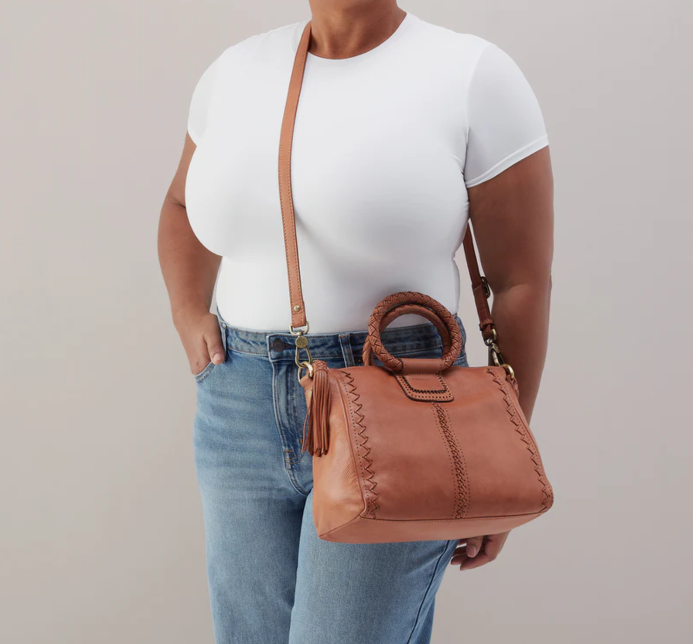 A medium satchel with a top handle and an adjustable removable strap.
