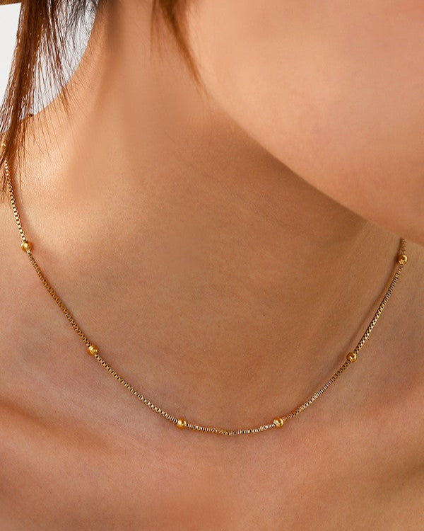 The Chain Reaction Necklace is a sleek and elegant gold chain that adds a subtle shine to any outfit. Its simple design makes it perfect for everyday wear or layering with other pieces to create a personalized look.