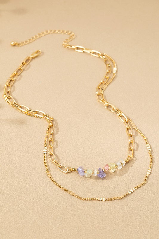 Elevate your style with the Color Cascade Necklace, featuring a stunning two-row mixed chain adorned with vibrant multi-color stones. This eye-catching piece adds a playful yet elegant touch to any outfit, perfect for making a bold statement or brightening your everyday look. Its versatile design ensures effortless pairing with both casual and formal wear, making it a must-have accessory for your collection.