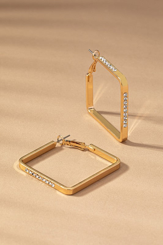 Add a touch of sparkle to your look with these pave rhinestone square hoop earrings. Their sleek square shape combined with shimmering rhinestones creates a modern, eye-catching accessory perfect for both everyday wear and special occasions. Lightweight and comfortable, these earrings effortlessly elevate any outfit with a subtle yet dazzling shine.