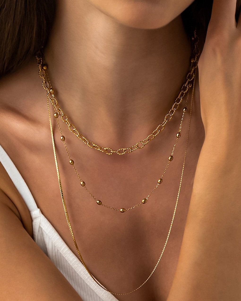 Elevate your style with the Golden Love Layered Necklace, featuring three delicate chains that create a stunning layered look. Crafted to add a touch of elegance to any outfit, this necklace effortlessly enhances your everyday wear or special occasions. Its versatile design makes it a perfect gift or a timeless addition to your jewelry collection.