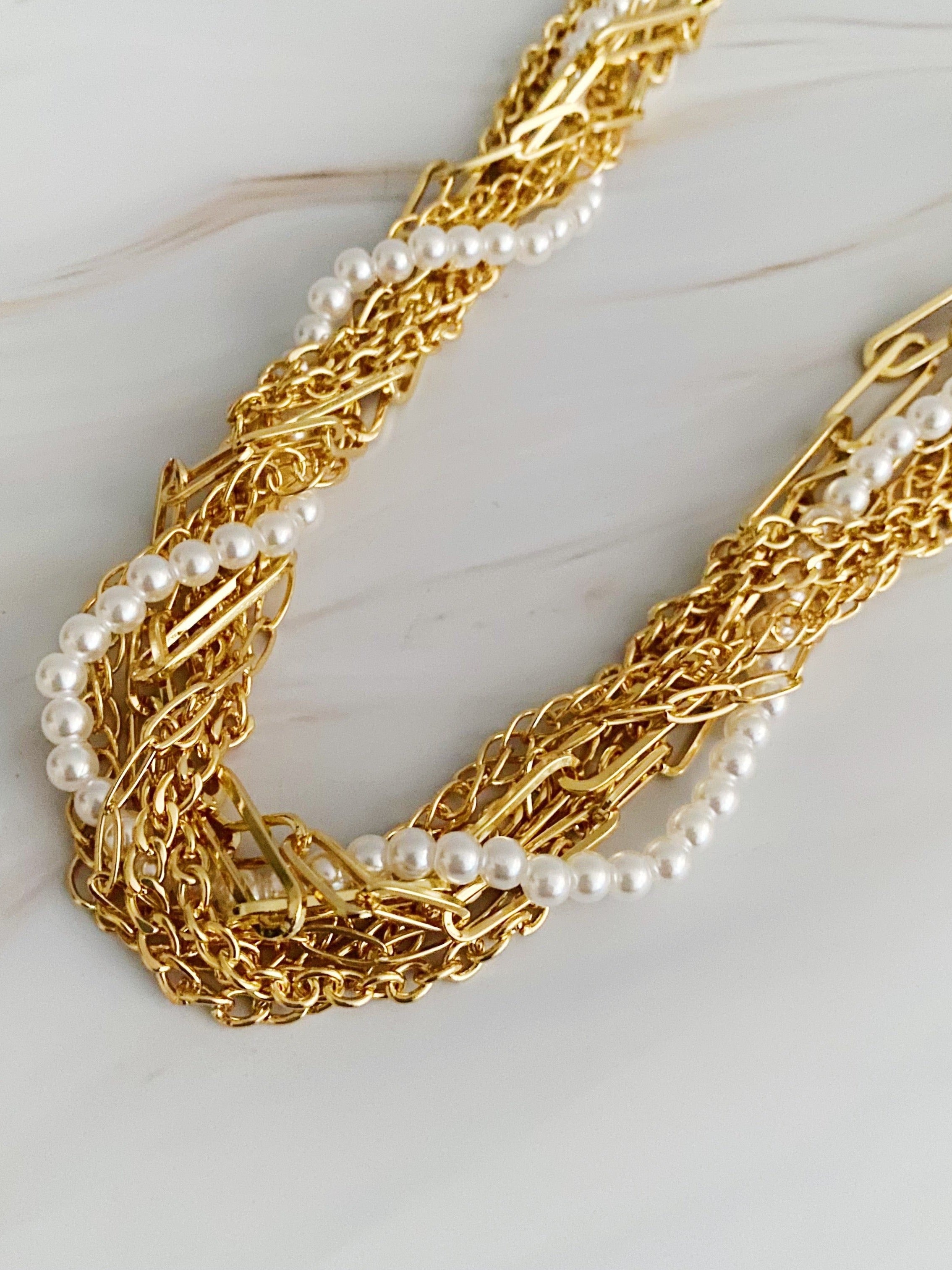 Make a bold impression with the Golden Tide Necklace, featuring a striking mix of chain styles intertwined with a delicate single pearl strand. This chunky statement piece effortlessly blends edgy and elegant, perfect for elevating any outfit with a unique, modern flair.