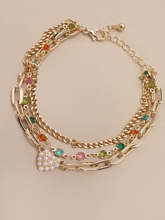Pearl Heart Multi-Color Stone Multi-Layer Bracelet, this bracelet features multiple layers adorned with lustrous pearls heart-shaped charms, and colorful stones, creating a stunning and eye-catching design.