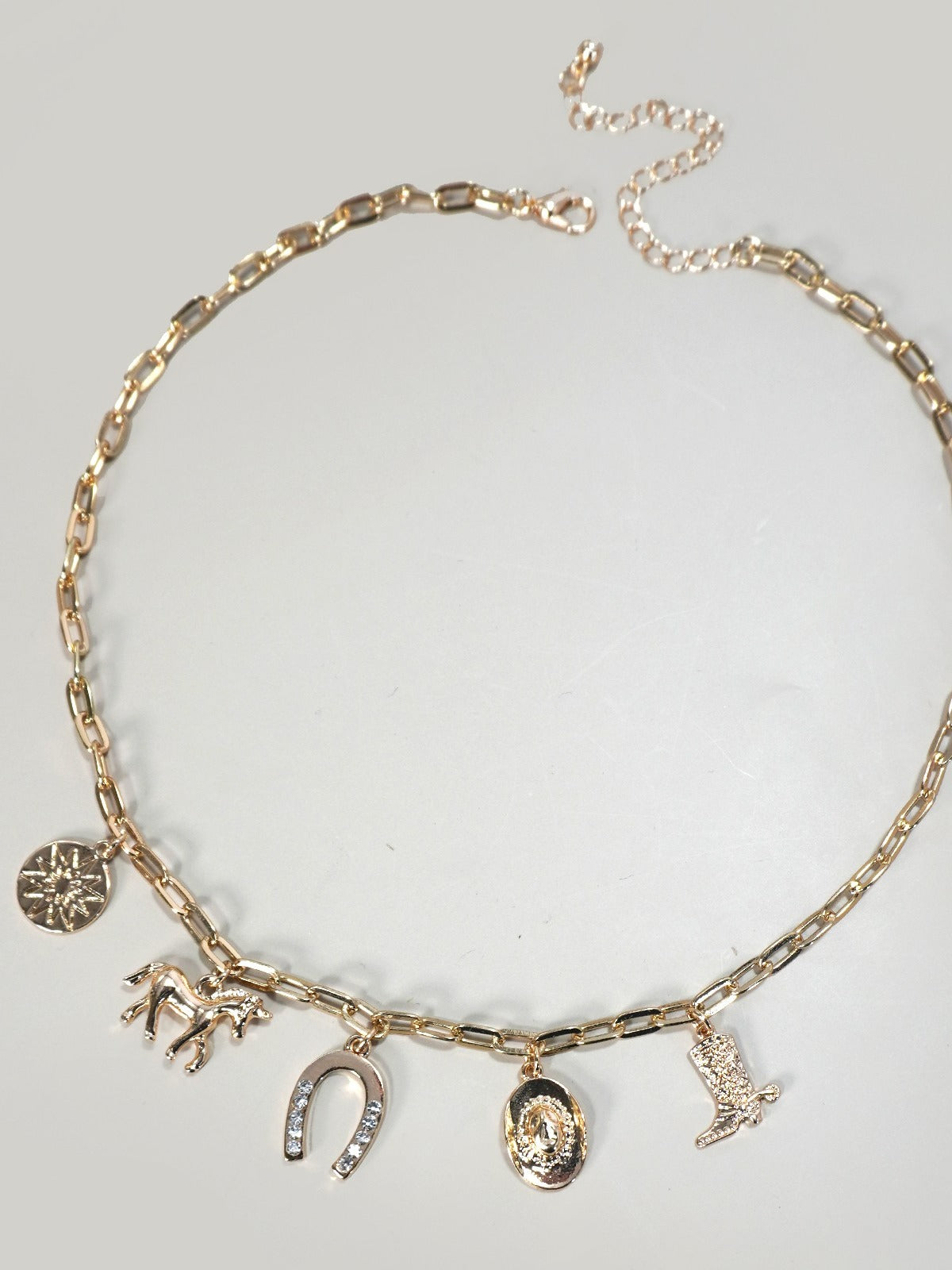 Get ready to saddle up with our Western Charm Necklace! Featuring iconic western-themed charms like a horseshoe, cowboy boot, hat, sun, and horse, this necklace captures the spirit of the Wild West. Add a unique and stylish touch to any outfit with this rustic and charming accessory. Yeehaw!