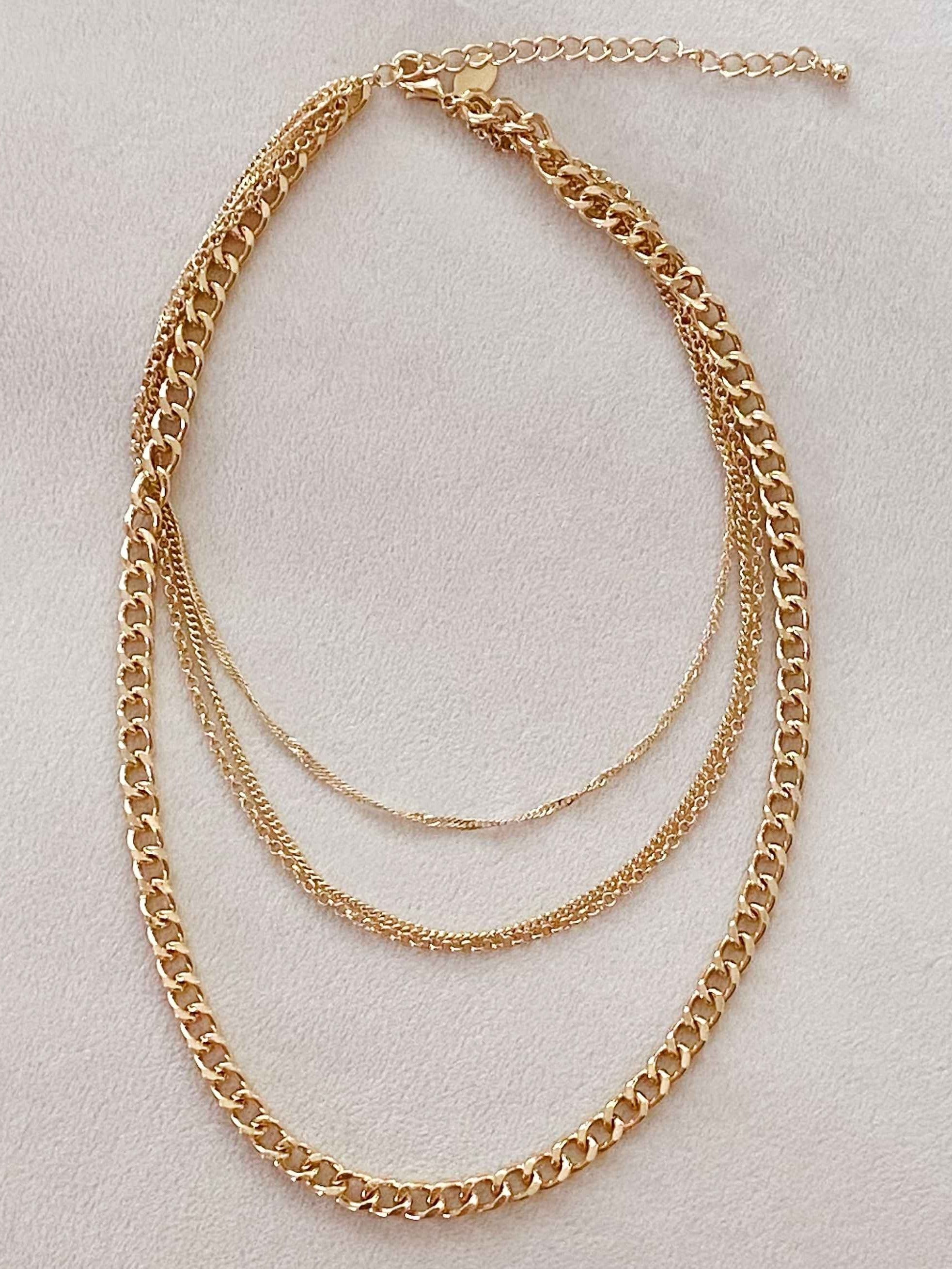 4 different chains perfectly layered in this piece. Dainty to bold, different chains make such stylish harmony! Has nice weight to it since it has cuban chain in the layers. First layer of chain
