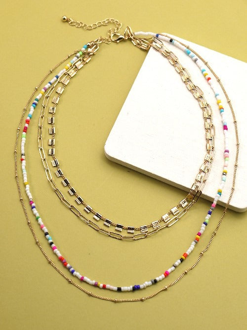 Give your ensemble the finishing touch with the four-row featuring different link chain and bead chain. Each chain is rendered in a high-polish finish, and the three different lengths to give a cascading look for an elegant-yet-edgy vibe along with fun beads