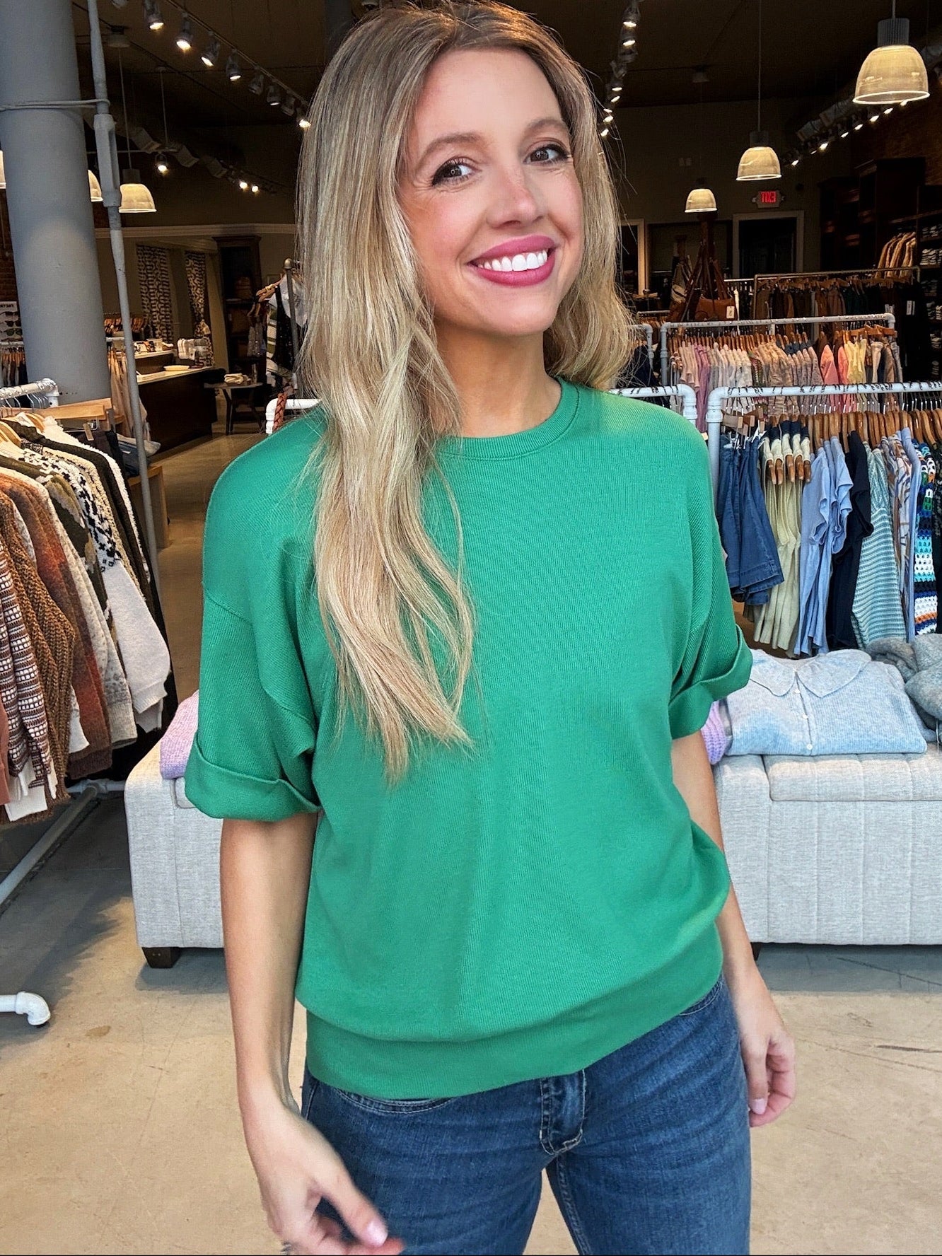 This ribbed cuffed sleeve top features a classic crew neckline, slightly dropped shoulders, relaxed short sleeves with wide cuffed hems, and a soft knit fabric for an effortless, modern look.