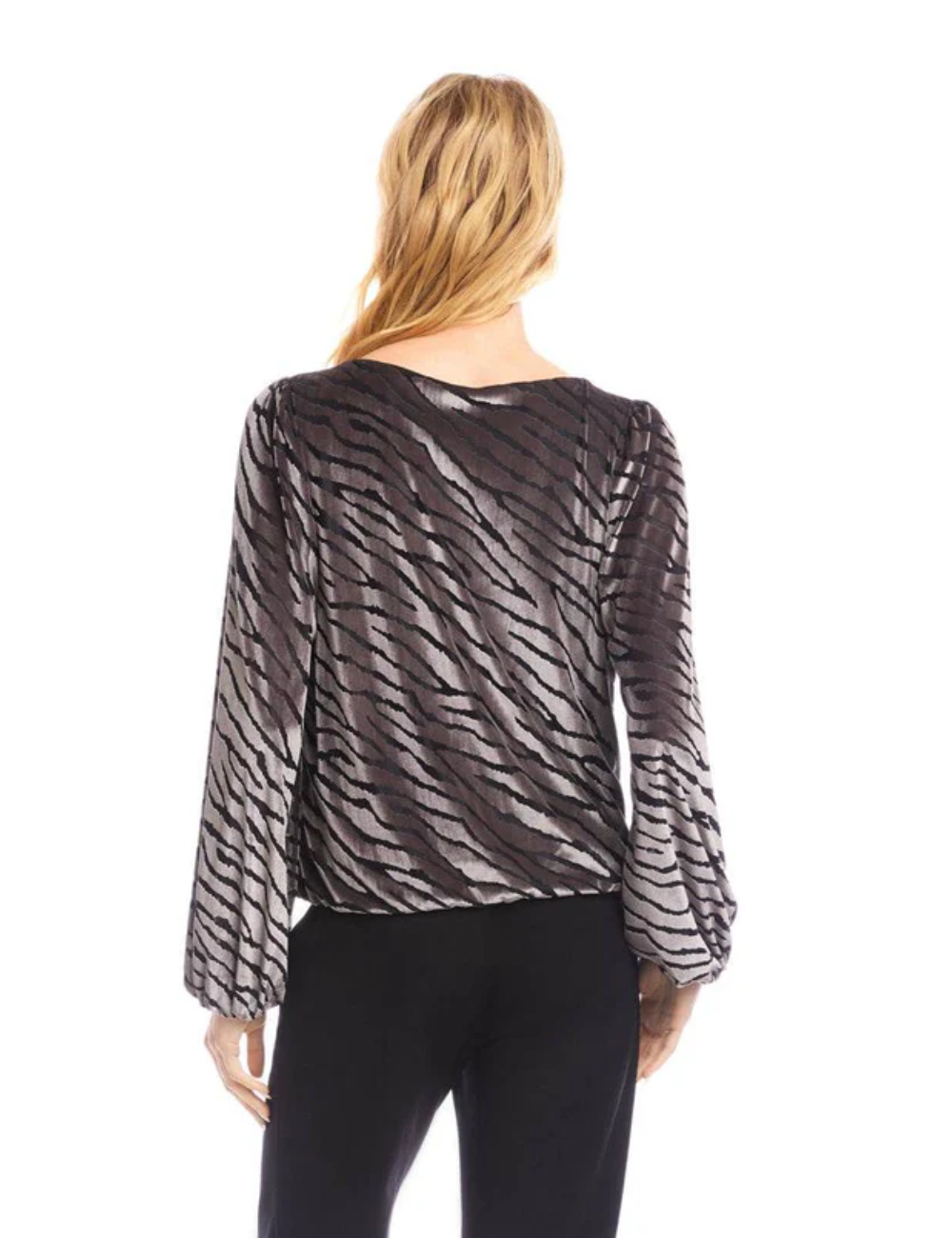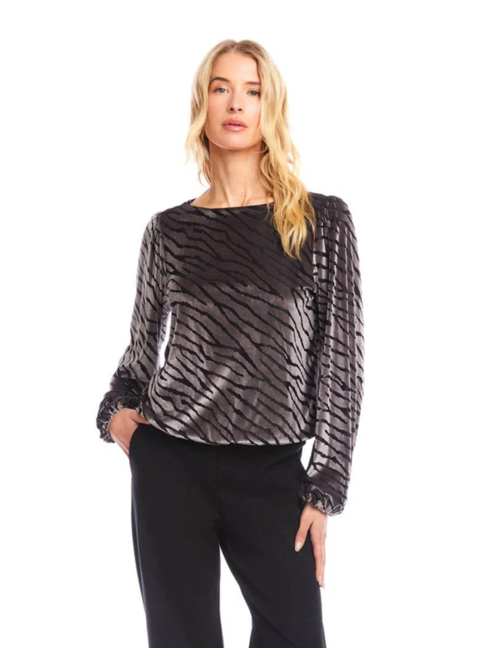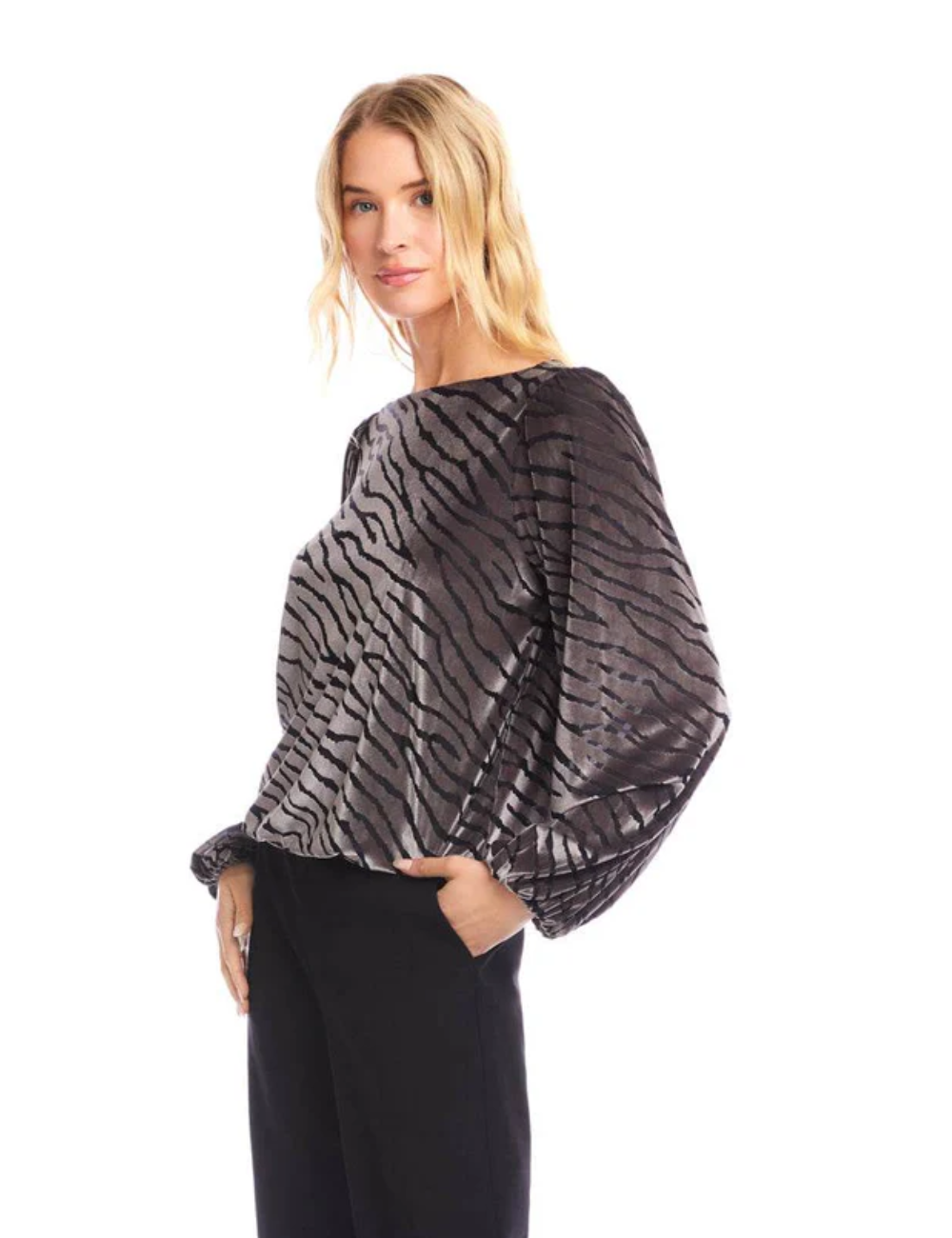 Elevate your look with this long-sleeve top featuring a chic boatneck and soft blouson sleeves. Crafted from luxurious zebra velvet burnout fabric, it adds a bold yet sophisticated touch with effortless pull-on styling.