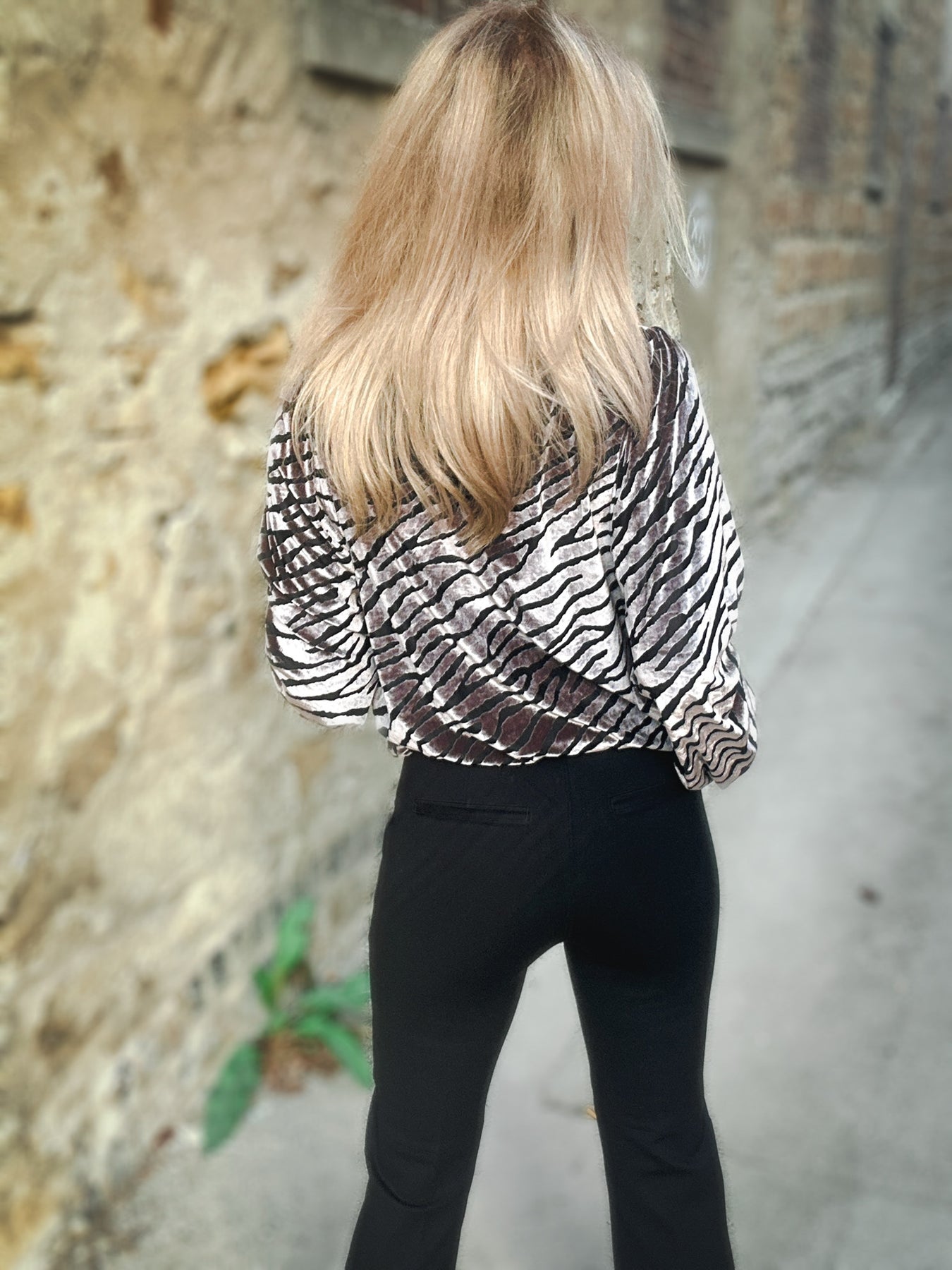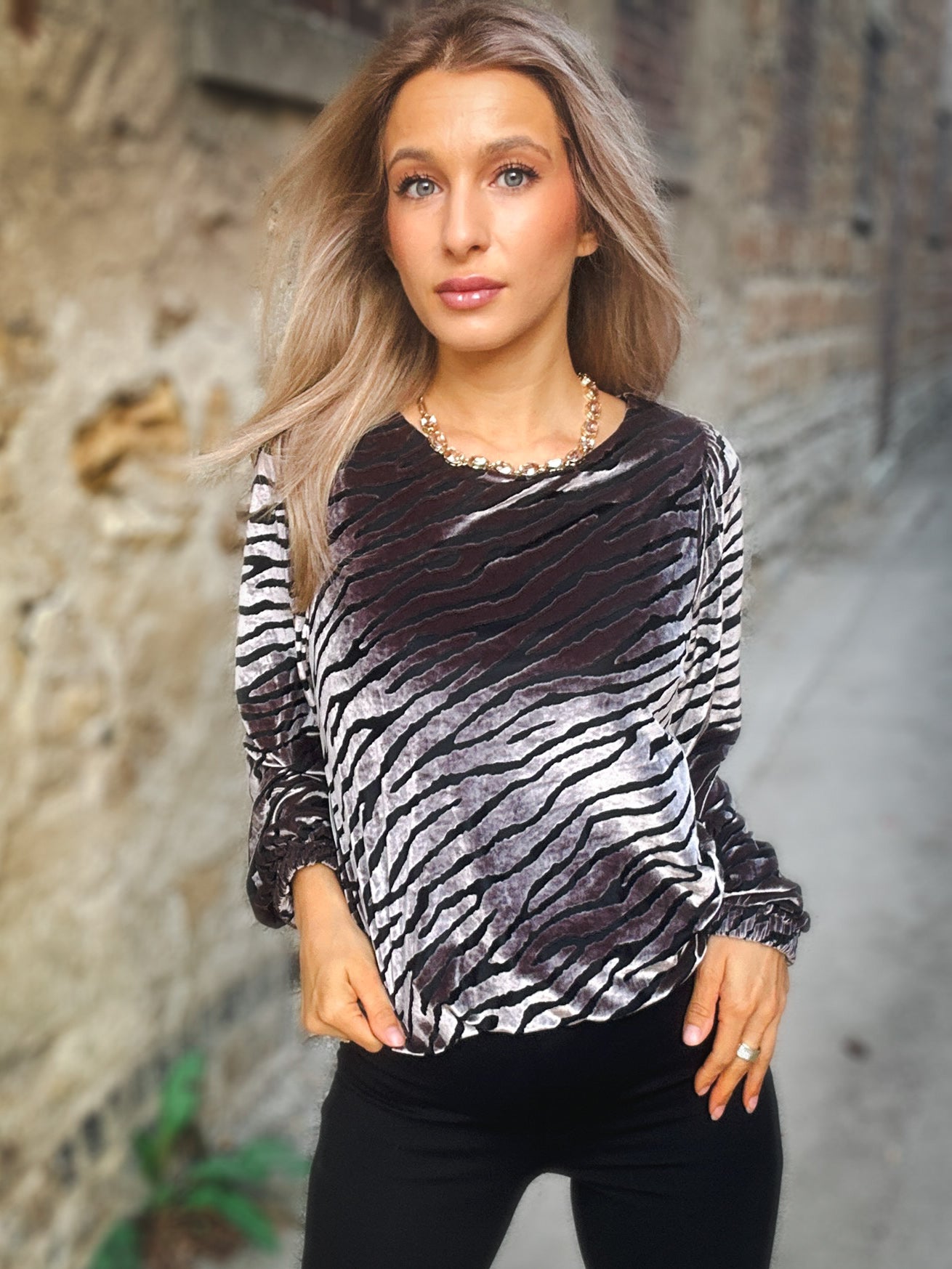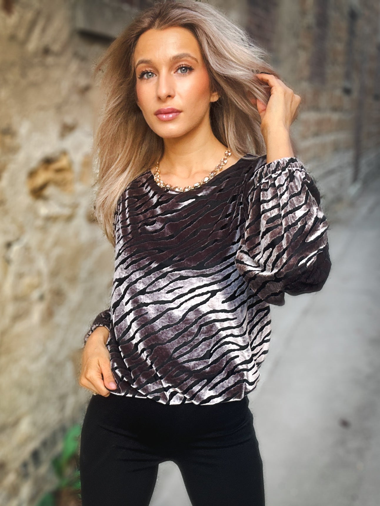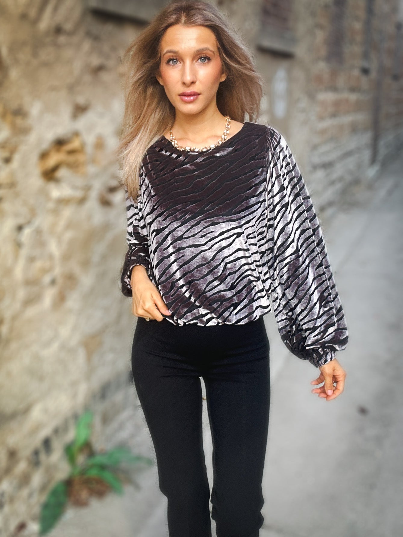 Elevate your look with this long-sleeve top featuring a chic boatneck and soft blouson sleeves. Crafted from luxurious zebra velvet burnout fabric, it adds a bold yet sophisticated touch with effortless pull-on styling.