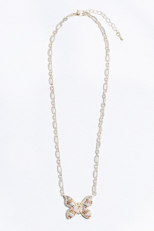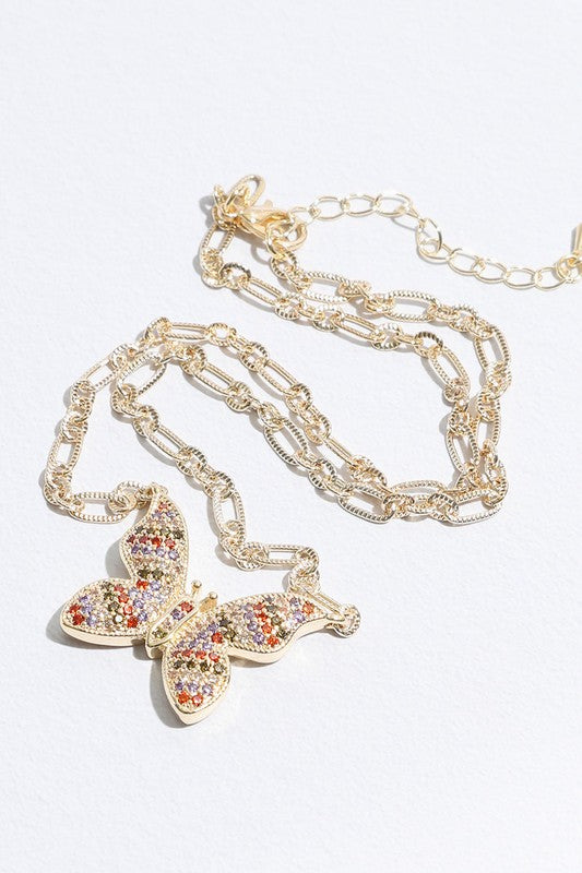 Embrace enchantment with this stunning multi-colored rhinestone butterfly pendant necklace. Each delicate wing sparkles with vibrant gemstones that catch the light beautifully, creating a mesmerizing display of color and brilliance. Perfect for adding a touch of whimsy to any outfit, this necklace celebrates nature's most graceful transformation. Whether you're dressing up for a special occasion or elevating your everyday style, this eye-catching piece makes a bold statement. The intricate rhinestone detailing ensures you'll turn heads wherever you go, making it an irresistible addition to your jewelry collection.