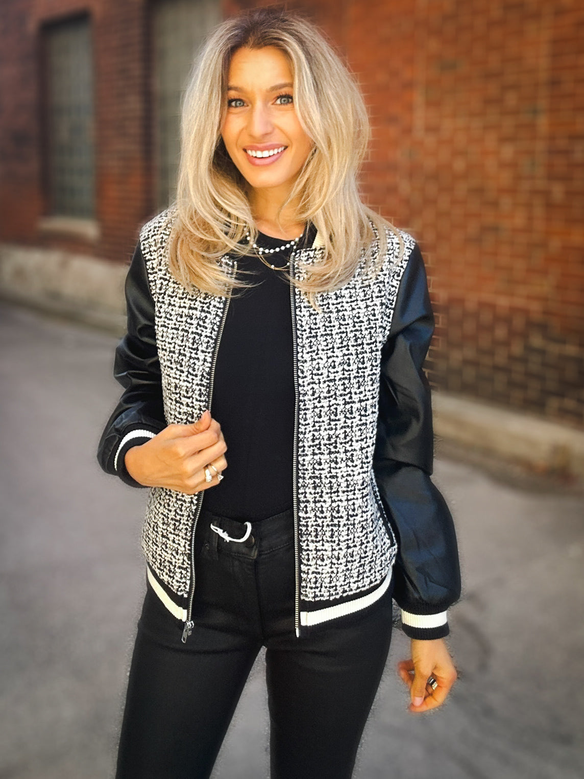 Elevate your style with the chic JANEL bomber jacket. The perfect mix of pleather and tweed in timeless black and white. Features a zipper closure and ribbed cuffs for a fashionable touch. Versatile for day or night, this jacket adds flair to any outfit.