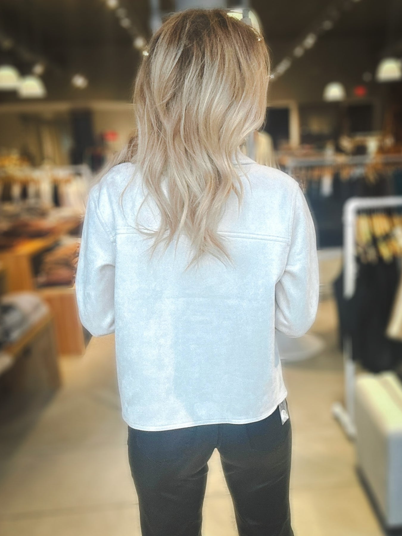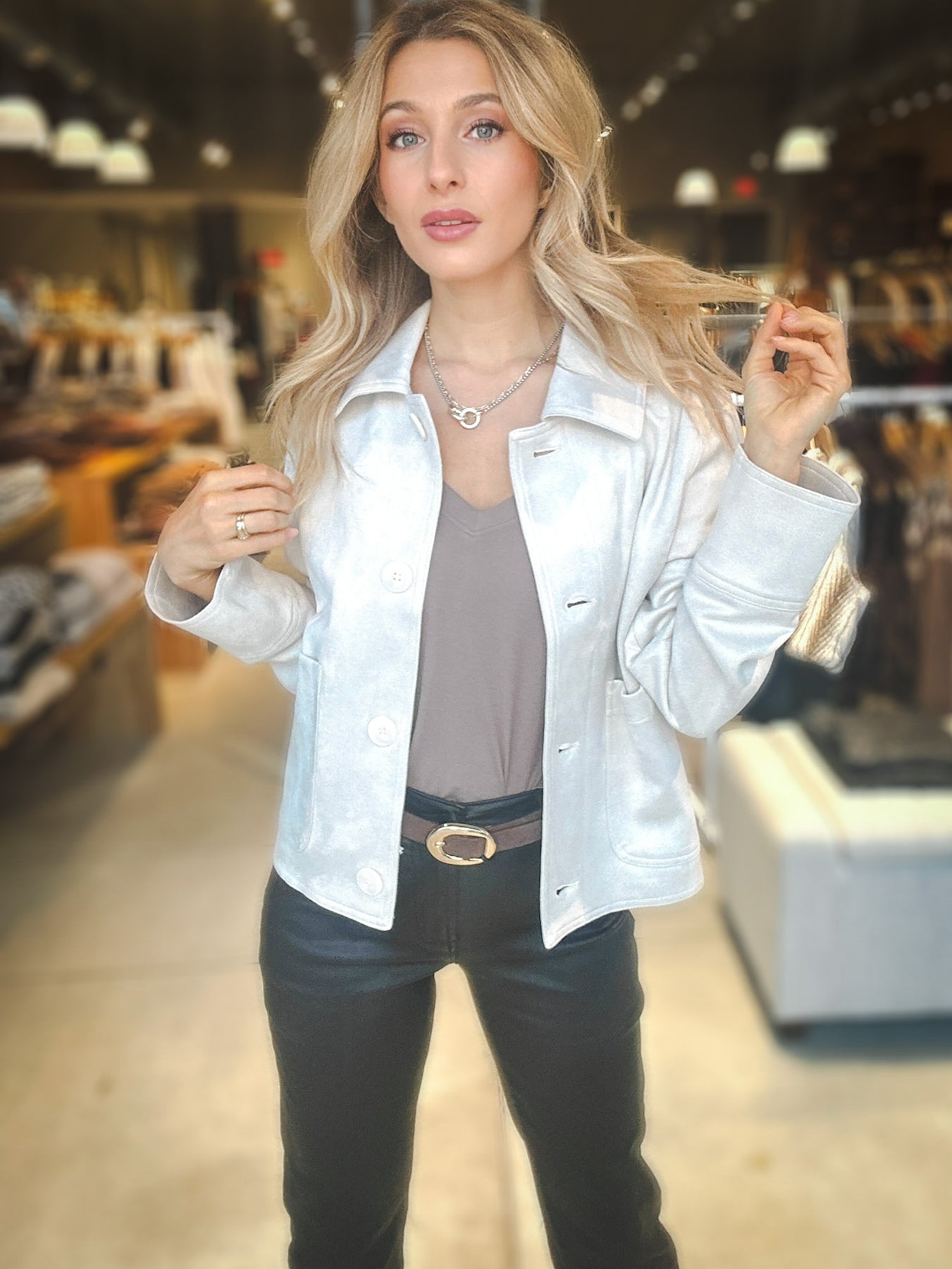 This cropped jacket is crafted from supple faux suede for a smooth, touchable finish. The boxy fit and button-front design make it a versatile layer that feels as good as it looks.