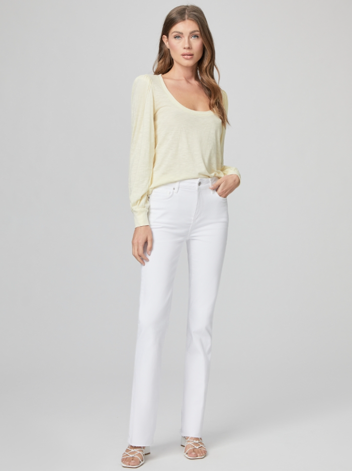 The High Rise Laurel Canyon is a vintage PAIGE style that has made a big comeback. This leg-lengthening high-rise flare has a slightly shorter 32" inseam and comes in a beautiful, crisp white with a raw hem. They designed this in the perfect white fabric that holds you in, is never see-through and gives plenty of coverage so you can feel your most confident.