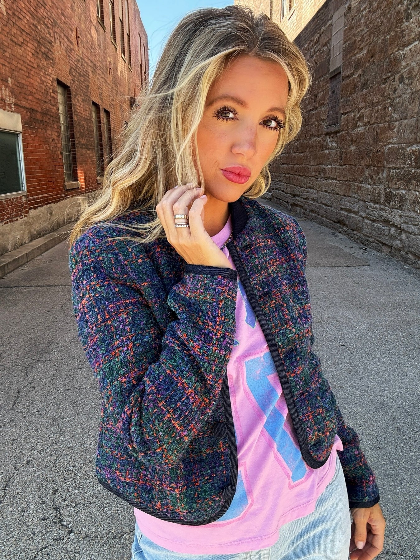 The Steve Madden Carlene Jacket is your answer to effortless polish with a modern twist. Crafted in luxe textured tweed with a clean snap-front closure, this piece brings timeless structure and just the right amount of edge. Whether you're layering it over a satin slip dress or pairing it with distressed denim, the tailored silhouette and crisp collar make every outfit feel instantly elevated.