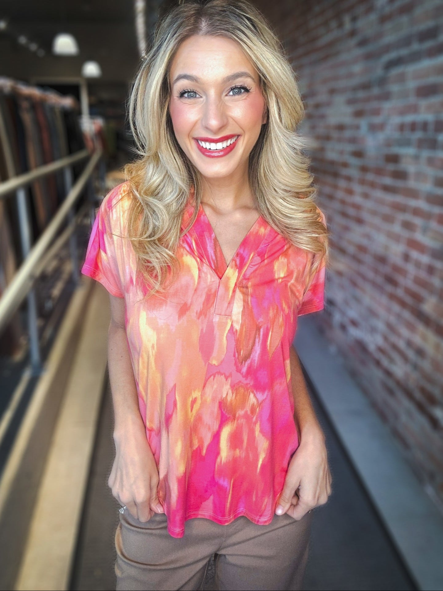 Embrace the joy of color with our Renuar Colorful Days Top! Featuring a beautiful and lively print, this top adds a pop of color to any outfit. The short flutter sleeves add a playful touch while the button up design allows for versatility. The rounded hem completes the look with a flattering shape.