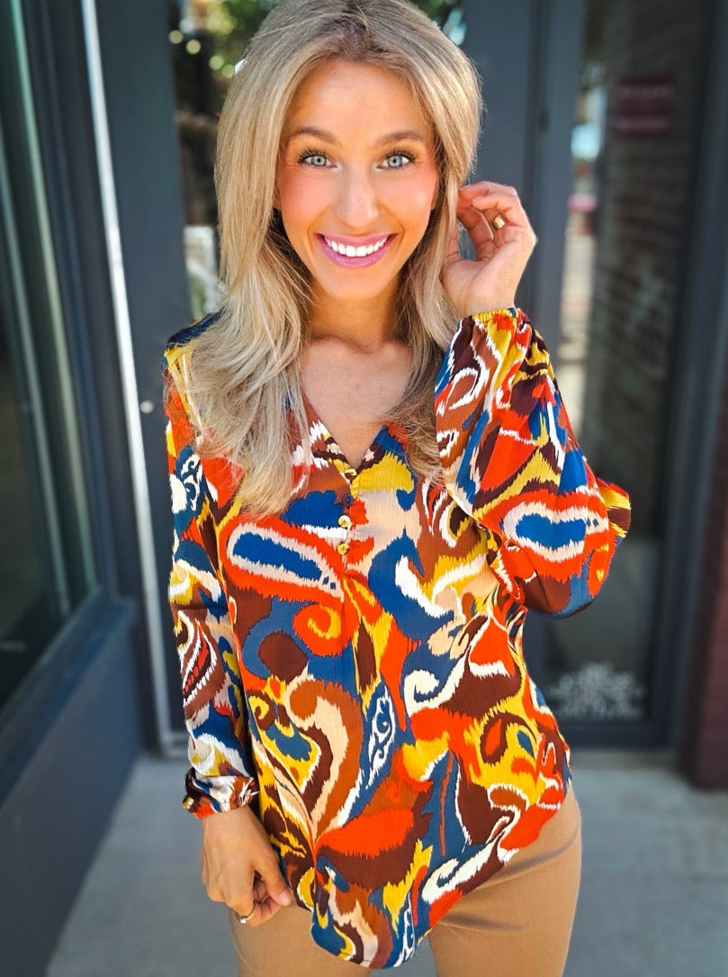 Indulge in the vibrant beauty of the Renuar Sweet One Blouse. With its v-neck, long sleeves, and elastic cuffs, this blouse brings comfort and style together. Its abstract colorful print and satin sheen exude a sense of energy, making you stand out with every step. Elevate your wardrobe and make a statement with this stunning blouse.
