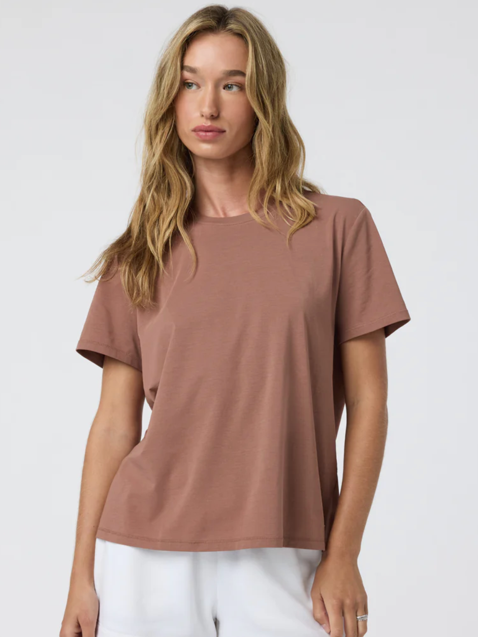 The lightest organic cotton you can imagine comprises this new-favorite tee, made with performance stretch knit in a soft, relaxed feel and fit. Great for yoga, travel, and hanging outside.