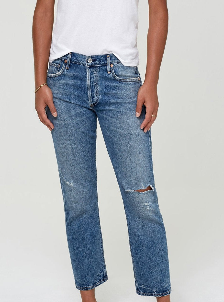 Acquired from him, tailored to you. You’ll find yourself reaching for this signature boyfriend jean weekend after weekend. The slimmest of Citizens of Humanity's relaxed fits, the Emerson features a low-rise and flattering ankle-length inseam. Easily dressed up or down, these look great with a feminine heel or causal sneaker.