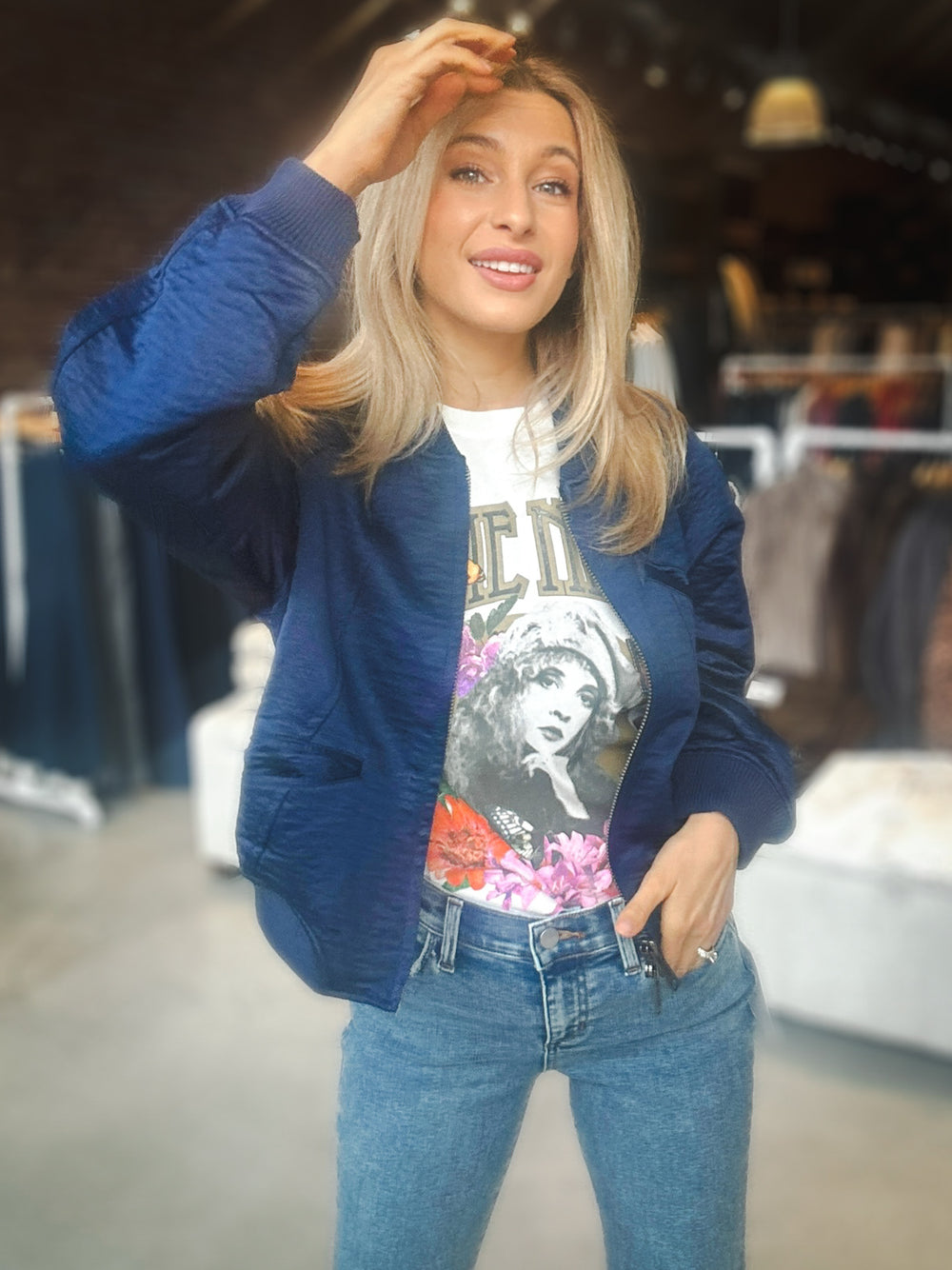 Just as cool as it is classic, this bomber jacket features a cropped, fitted silhouette, satin fabrication, and exaggerated sleeves.