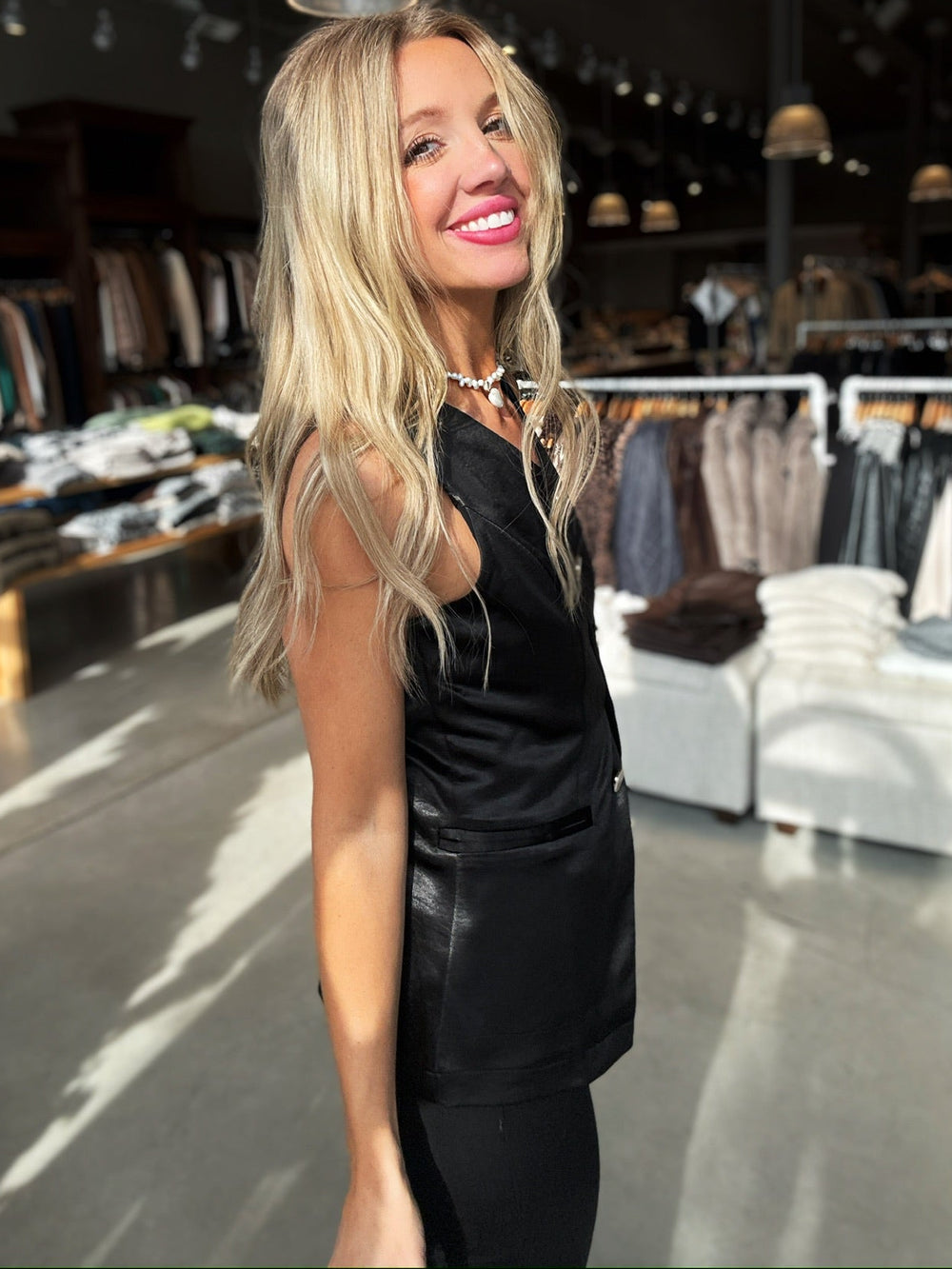 The long vest features button-front design and tailored back waist detail has a fluid, smooth finish with a subtle crinkle texture, its heavier weight adds structure.